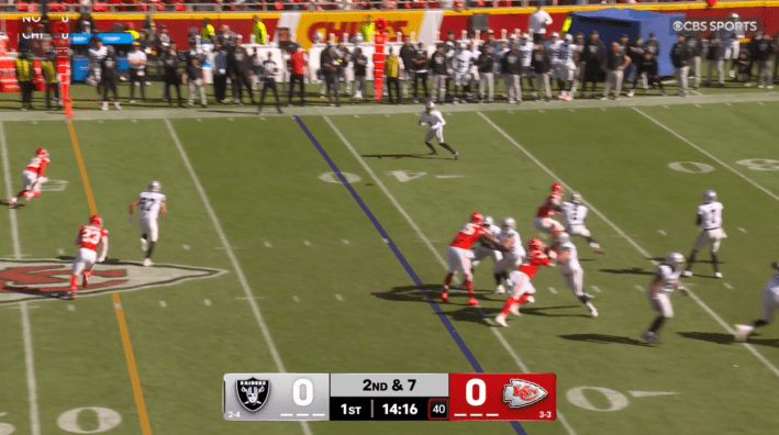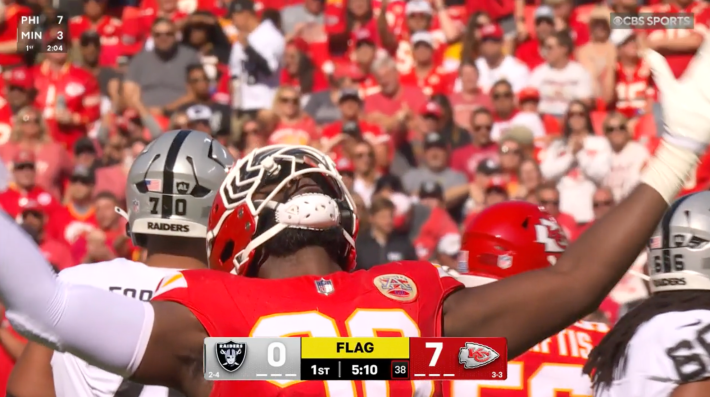 LV 0, KC 7 - 5:18 remaining in the first quarter: On this play, Geno Smith took a nine-yard sack. Or so it seemed, until Kansas City defensive back Trent McDuffie was flagged for illegal contact around midfield. Vegas was, mercifully, awarded an automatic first down. “That’s huge,” Romo said, “because this momentum was shifting very quickly.” The momentum retaken, the Raiders offense could now get rolling.