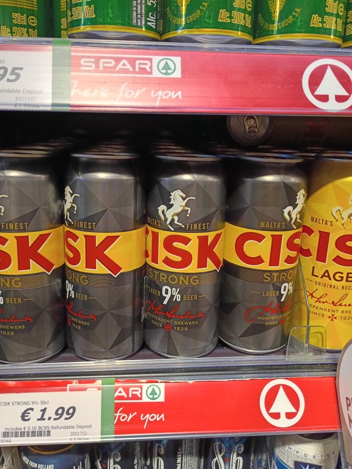 Cisk Strong, Malta's tajjeb-est beer. Two euro for half a liter and a 9% ABV will get you there.