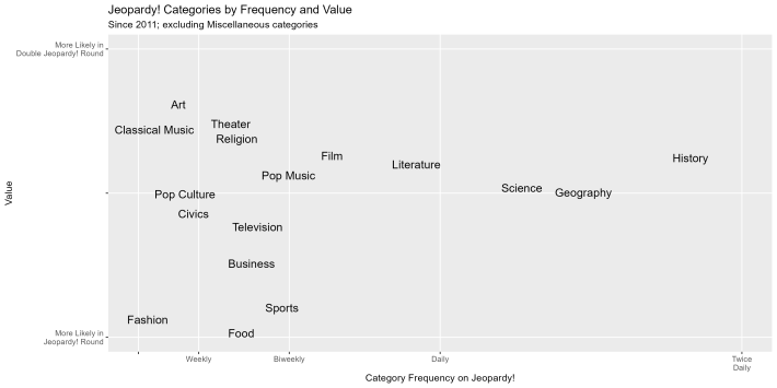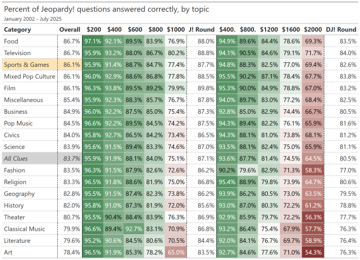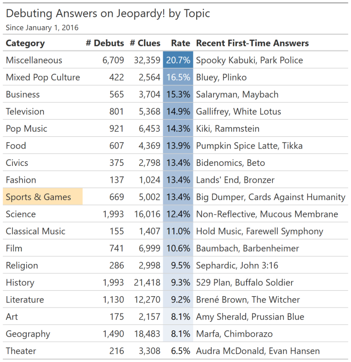 The above table shows the frequency over the past decade that the correct answer to a Jeopardy! question had never been an answer before. (The full explanation of how I produced this data is available here.) Ignore “miscellaneous”—a label which includes a lot of oddball answers like “Mutiny on the Bounty Hunter S. Thompson”—and most of the top of this list is mass culture, including the “sports & games” group (which is, if you’re curious, 85 percent sports, 15 percent games). Topics with this higher churn create two problems for anyone trying to bone up on the subject: There’s both more to learn if you haven’t been keeping up, and it’s less obvious what, specifically, you’re supposed to catch up on.