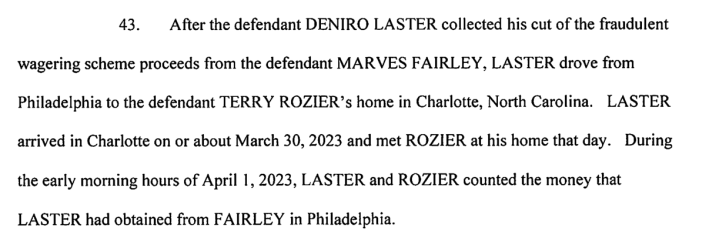 The alleged scheme involving Rozier had to do with the manipulation of prop bets. The gamblers supposedly used non-public information about NBA players, and a network of straw bettors operating on online sportsbooks and in-person casinos, to bet hundreds of thousands of dollars. They bet the under on the players who intended to play worse, or remove themselves early from games. The example cited by New York City Police Commissioner Jessica Tisch was a game on March 23, 2023, when Rozier left the game after nine minutes of play. Later that evening, Tisch said, his co-conspirators assembled at Rozier's house to count tens of thousands of dollars in winnings. (The NBA had previously investigated Rozier for betting patterns around that game, but cleared the player of any wrongdoing.)