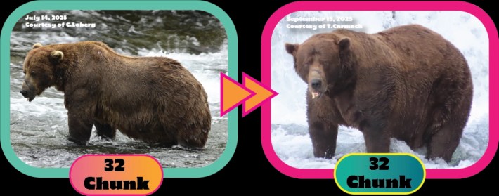 The brown bear identified as Bear 32 at Alaska's Katmai National Park has been in the news a lot the last few years, and not for winning the park's annual Fat Bear Week competition. As with all high-level competitors, this is not usually a good thing. When the bear, nicknamed Chunk, lost two finals in a row, he gained a reputation as a loser. When Chunk mauled and killed the cub of Grazer, last year's winner, he gained a reputation as a sore loser. When Chunk dragged away the carcass of another dead bear in order to eat it, he gained a reputation as just kind of a bad dude. Chunk is trouble.