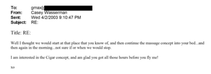 In 2002, Wasserman joined Maxwell, Bill Clinton, Kevin Spacey, Ron Burkle, Chris Tucker, "about four women ages 20 to 22," and Epstein himself on a two-week trip to Africa aboard Epstein's infamous Boeing 727, nicknamed the Lolita Express. Spacey told the Los Angeles Times that the purpose of the trip was to "raise awareness and funds for HIV/AIDS" and "spend an unforgettable day with Nelson Mandela." Wasserman and Maxwell's emails date to a few months after that trip. I will simply note here a 2024 Daily Mail story alleging that the now-divorced Wasserman is a "serial cheater" with a "chronic condition of sleeping with people who work for him," and will also note that he is currently dating Jenny Chandler, who first worked as a flight attendant on his private jet.