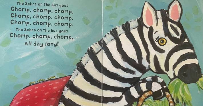 Before I had a kid, I questioned the need for the abundance of Wheels on the Bus variations. Now I understand that there is no upper limit to the ideal amount of things that could happen in threes on buses. All day long, all through the town—a la Speed, it doesn’t matter what we’re doing as long as the bus keeps going. In Cabrera’s iteration, many animals do many things on a bus winding its way through the jungle. But these three caterpillars show up several times, yet throughout the book they remain completely unacknowledged. (Lest you think this is because the word “caterpillars” presents a problem syllabically, let me assure you that Cabrera could not give less of a shit about that. She’s more than willing to force you to flail through “the bush babies on the bus go snore snore snore.”) I’m always tempted to ad lib “the caterpillars on the bus go scoot scoot scoot,” but something holds me back. Perhaps the premise is that the caterpillars must be ignored so that the zebra can shine. Perhaps the caterpillars are an Easter egg, and the love of the few who discover them will make up for the indifference of the wide world. Perhaps the caterpillars represent the pauses between the notes, the little silences without which there would be no song. We may never know.