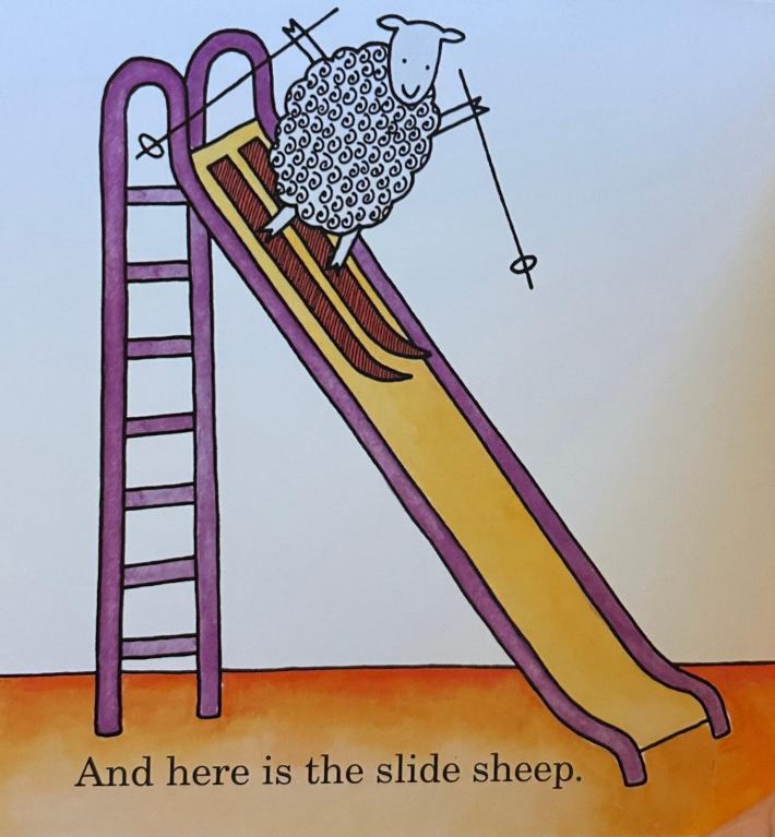 Red sheep, blue sheep, bath sheep, bed sheep—sure, sure. I’m willing to suspend one layer of disbelief per sheep, at least in the opening pages. But the slide sheep doesn’t belong. You’re telling me this ovine climbed a ladder while carrying skis and poles and put them on while balancing at the top of the slide? Or what? What is the alternative? I can see how things progress from here. The future is clear, unambiguous, inevitable. The past, however, is utterly opaque.