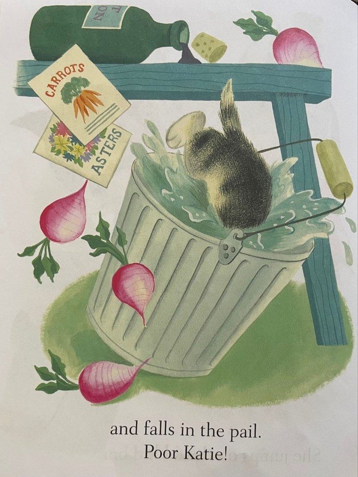 The bottle of poison seems like an ominous Easter egg to plant in the tale of one kitten’s mishaps. Then again, there’s no sugarcoating in Katie the Kitten. A few pages before this incident with the bottle of poison, Katie climbs an old apple tree in hopes of murdering three baby birds. The thing that gets me about the poison is that it’s like Chekhov’s gun. The dark promise is fulfilled: the poison spills. Sure, in a way this is like every other mess Katie has left in the wake of her rampage. But this is a book meant—one presumes—for parents to read to their tiny children, parents who have spent their days triaging messes left in the wake of their progeny’s rampage. This bottle of poison asks: Are you forgetting something important? Perhaps even deadly? Which is, of course, the scariest of all questions to plant in the sleep-deprived mind of the adult who is just trying to make it through the bedtime routine.