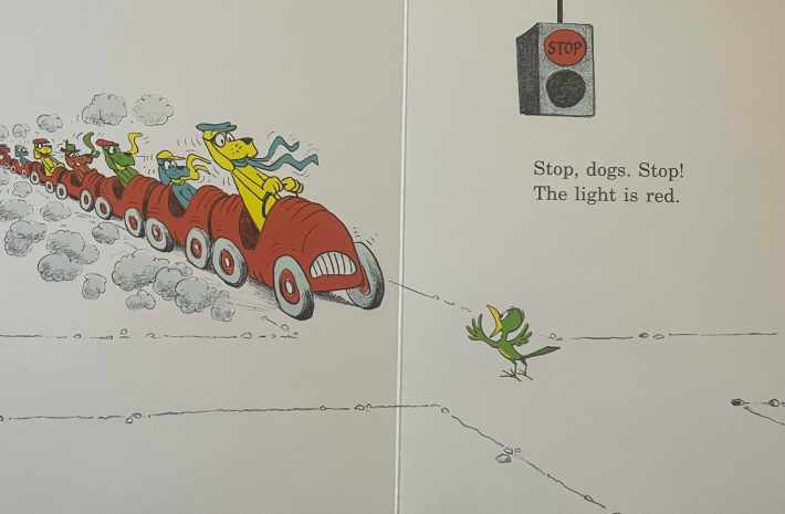 On first glance, this bird is a run-of-the-mill busybody. Admittedly, I have not read the unabridged version of Go, Dog. Go! for several decades, so perhaps the board book omits crucial character development for green bird. And perhaps there’s a kind of justice in the bird telling the dogs how to go, considering that later a bunch of dogs are going to throw a rager in the bird’s tree. But why is the bird crossing the street by foot? Why has the bird stopped in the exact center of the intersection? Is the bird the narrator of the entire book, popping down from on high just to illustrate how all these dogs are puppets in the face of avian omnipotence?