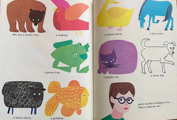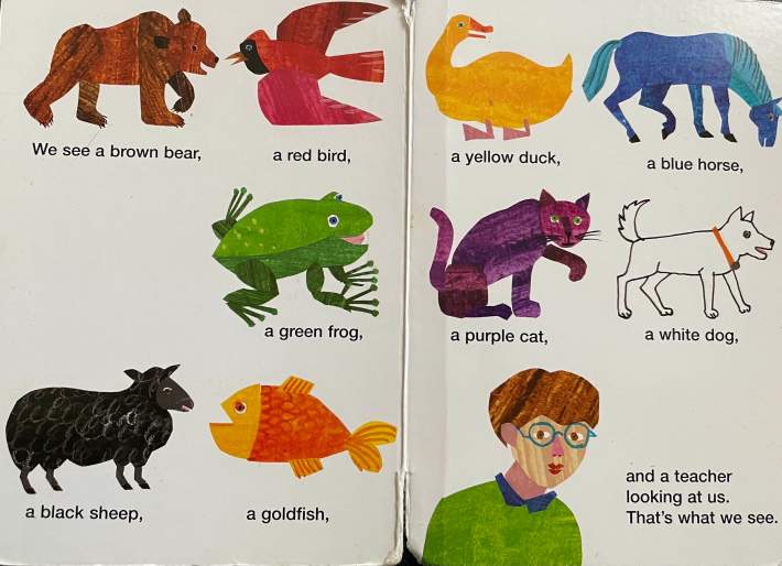 We’ve acquired several versions of this book over the last year-and-change, as one does. My kid eats all that repetition up: “Brown Bear, Brown Bear, what do you see? I see a red bird looking at me. Red Bird, Red Bird, what do you see? I see a yellow duck looking at me.” But the more times I’m confronted by this recap at the end, the more I struggle with the fact that most of these animals are not looking left at the animal who first names them, nor are they all looking right at the animals they see in turn, nor are they looking outward toward the viewer (which would probably have been the safest choice, if no one could figure out how to apply the 180-degree rule to this scenario). We can all agree that this is a book about looking and seeing, right? We’d have no vehicle to get from the brown bear to the children without the hot potato of the gaze. Either all these illustrations are meant to evoke the Mona Lisa effect, or more than half of this book is made of lies. In modern editions, we can trust the brown bear, the black sheep, maybe the goldfish, the teacher, and the children. Since it would have been easy enough—even back in the day—to construct the book with illustrations in pairs so that the brown bear and red bird face one another, and to flip the images as necessary as the narrative goes on, I’m forced to conclude the point of this book is to teach toddlers to question everything. I have one question for you, Bill Martin Jr.: Why?