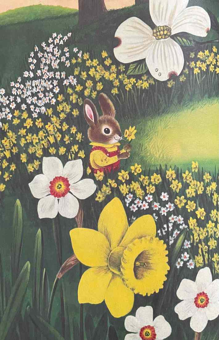 How big is Nicholas the bunny? Exactly as big as circumstances demand in order to optimize his cuteness. The shapeshifting is mild, sure, but it’s inarguable, and Nicholas’s savvy understanding of how to charm us is creepy in exactly the same way influencers who actually get you to follow are creepy. Nicholas is meant to make you smile. He shelters from the rain under toadstools and puts on tiny mittens when it snows. He could be sweetness incarnate, he could be a metaphor for childlike wonder, he could be the spirit of the seasons, he could be the pleasure we take in dollhouse furniture made animate, he could be the embodied vibe of a ladybug, but I’m telling you: This li'l guy is not a bunny.