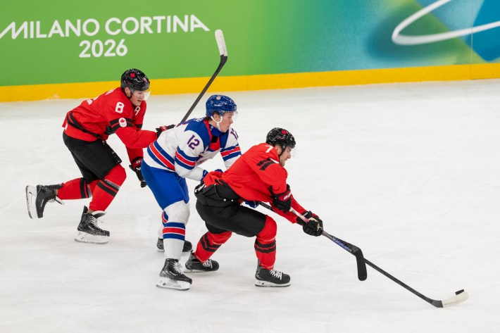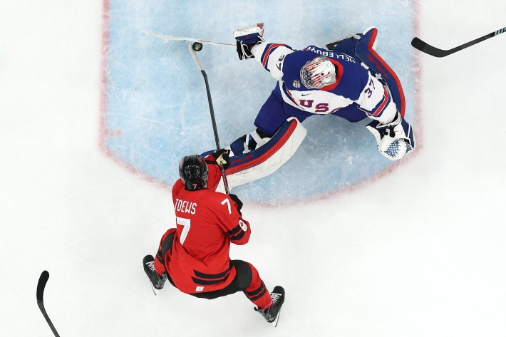 The game, unsurprisingly, was a demolition derby to start, with tons of opportunities for both sides of this rivalry to show off how strong and tough they are on a slightly undersized Italian rink. The U.S. didn't even get a shot off in the first six minutes, but Minnesota Wild youngster Matt Boldy made the first one count with a sick goal that saw him push the puck past two elite defensemen and then outskate them for a point-blank chance. Better than the highlight video, in truth, is this photo that shows how hard he had to work to keep Devon Toews from snuffing out the opportunity before it even began.