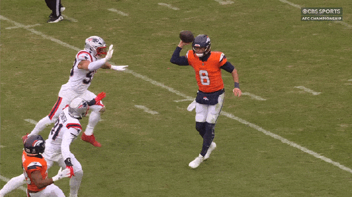 With three minutes to go in the second quarter, before the weather got too lousy and the announcers started saying "these conditions" every other sentence, Stidham faced a third down on his own 33. The guy seeing his first real NFL action in years took the shotgun snap and was quickly startled by the New England pass rush. He ran backward in a way that signaled to everyone watching that survival instincts had overtaken the play-call. But Stidham, to the chagrin of all Colorado, held onto something in his head that couldn't accept the idea of punting from slightly worse territory. He thought fast, but he thought wrong. As Christian Elliss closed in for the sack, Stidham pump faked, pulled the ball back into his body, and then tried to dump off a feeble chest pass for an incompletion, to avoid losing yardage. It took some sorting out by the officials, but the end result was a backward pass recovered by New England, who got their lone touchdown of the game two plays and 12 yards later.