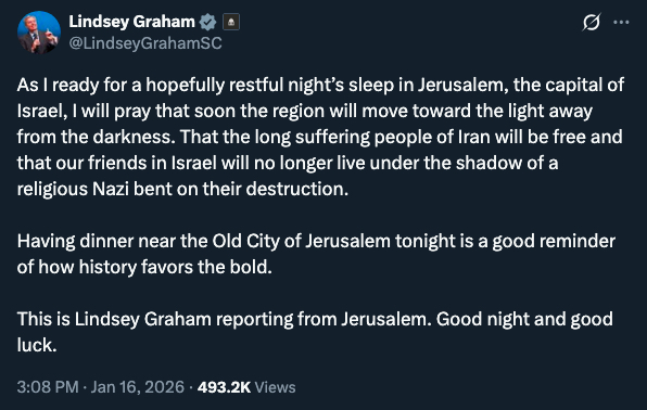Lindsey Graham has been on a mission from God. The senator from South Carolina said on Jan. 15 that he would take a spontaneous trip to Israel, less than a month after his visit to meet with Prime Minister Benjamin Netanyahu and Ambassador Mike Huckabee to discuss the purported ceasefire in Gaza. This time Graham was here to lobby, as a man alone and a trusted friend, to make sure a devastating war came to Iran’s shores as soon as possible.