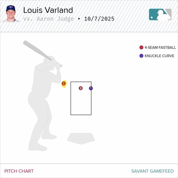 After scoring the Yankees' first run, Judge doubled home the second in the bottom of the third. By the time he came up again in the fourth, it was 6-3, and there were two men on, thanks to Addison Barger dropping a pop-up. Louis Varland went knuckle-curve away, fastball up, to get Judge to 0-2. Then he threw what was, what should have been, what would have been against anyone else a purposeful wasted pitch inside, to keep Judge honest and make him think twice about diving out over the plate.