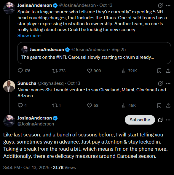 NFL insider Josina Anderson, pairing up her synonyms like on Noah's ark (or boat):