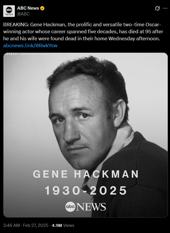 ABC News, clarifying the precise timeline of Gene Hackman's death: