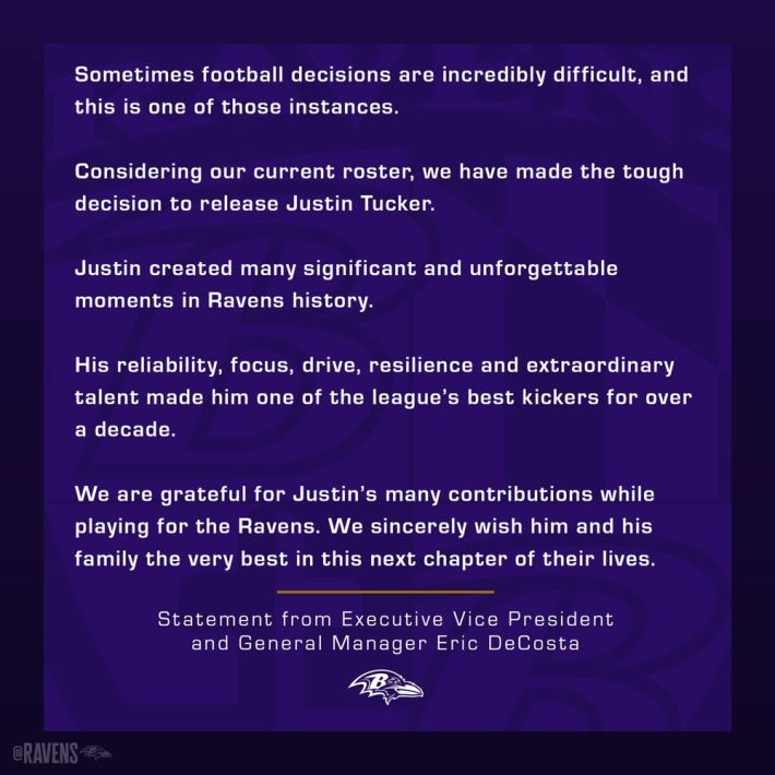 With the context of the Baltimore Banner's reporting on Tucker, the statement feels weird and slimy, pointedly ignoring the key reason why you'd distance yourself from any guy who 16 different women have said acted inappropriately. Referring to the release as a "football decision," and immediately adding that the call was made by "considering our current roster," Baltimore's statement pretends that it's business as usual and does everything it can to ignore the impact of what those women have shared.