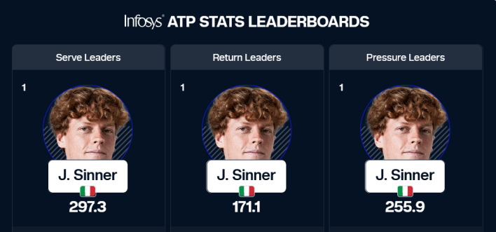 In the ATP's case, their partnership is primarily with Infosys, which is the official Digital Innovation Partner of the ATP. The first item on their partnership page encourages the viewer to download an app. Scroll down, and Infosys flexes their Serve and Return Tracker, declaring "from an eye on court to AI on court." Click "explore" and it takes you to the ATP Stats Leaderboard, again, but a different dropdown from the Insights page, with values that make even less intuitive sense. What does a 297.3 mean? A 171.1?