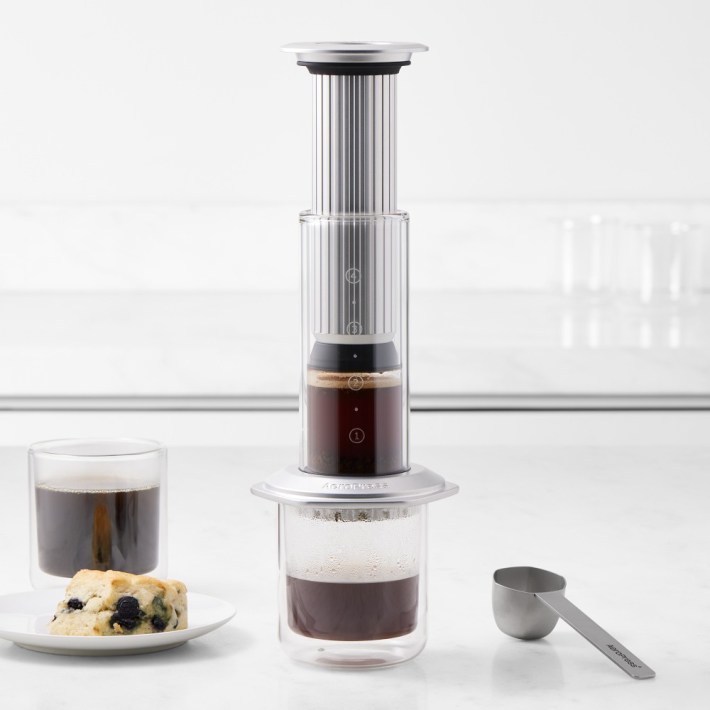 Copy: “The best-in-class Premium AeroPress is made of glass, stainless steel and aluminum for superior utility, durability and impressive presentation. Its double-walled glass chamber is expertly hand blown to precise measurements to brew exceptionally smooth, flavorful coffee.”