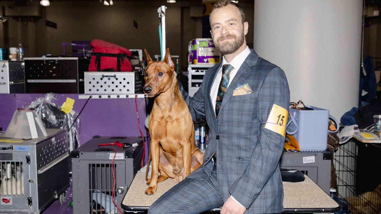As for the men, the options for creativity are limited only by your imagination—as long as it’s within the confines of a suit. Andrew Webber, who got his first showdog two years ago, has a light brown German Pinscher named Gravy. “As much as your dog looks nice, you want to look nice as well,” Webber tells me. To pair with Gravy, he wears a lot of blue and greens, and mixes patterns to add a little fun.