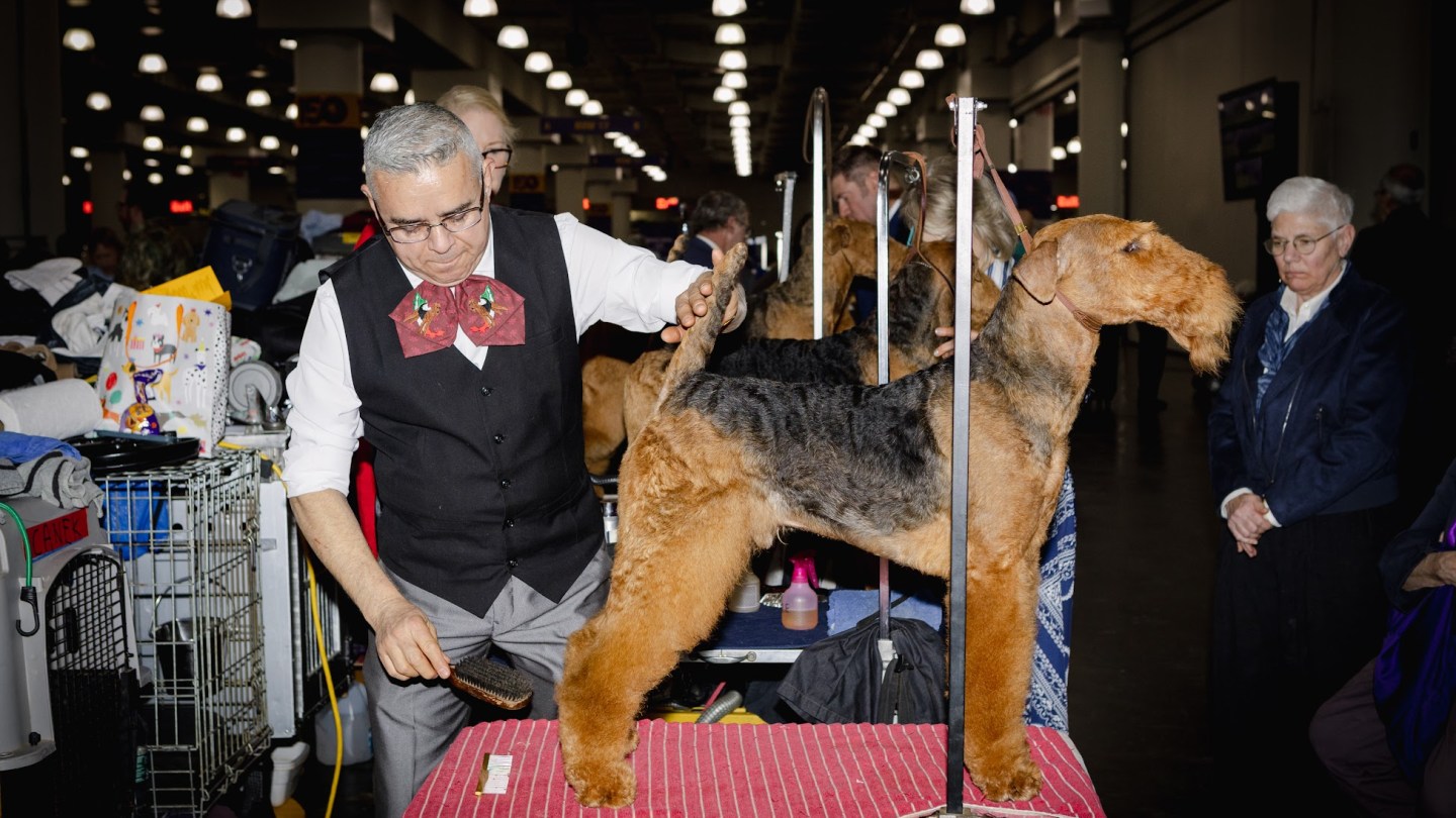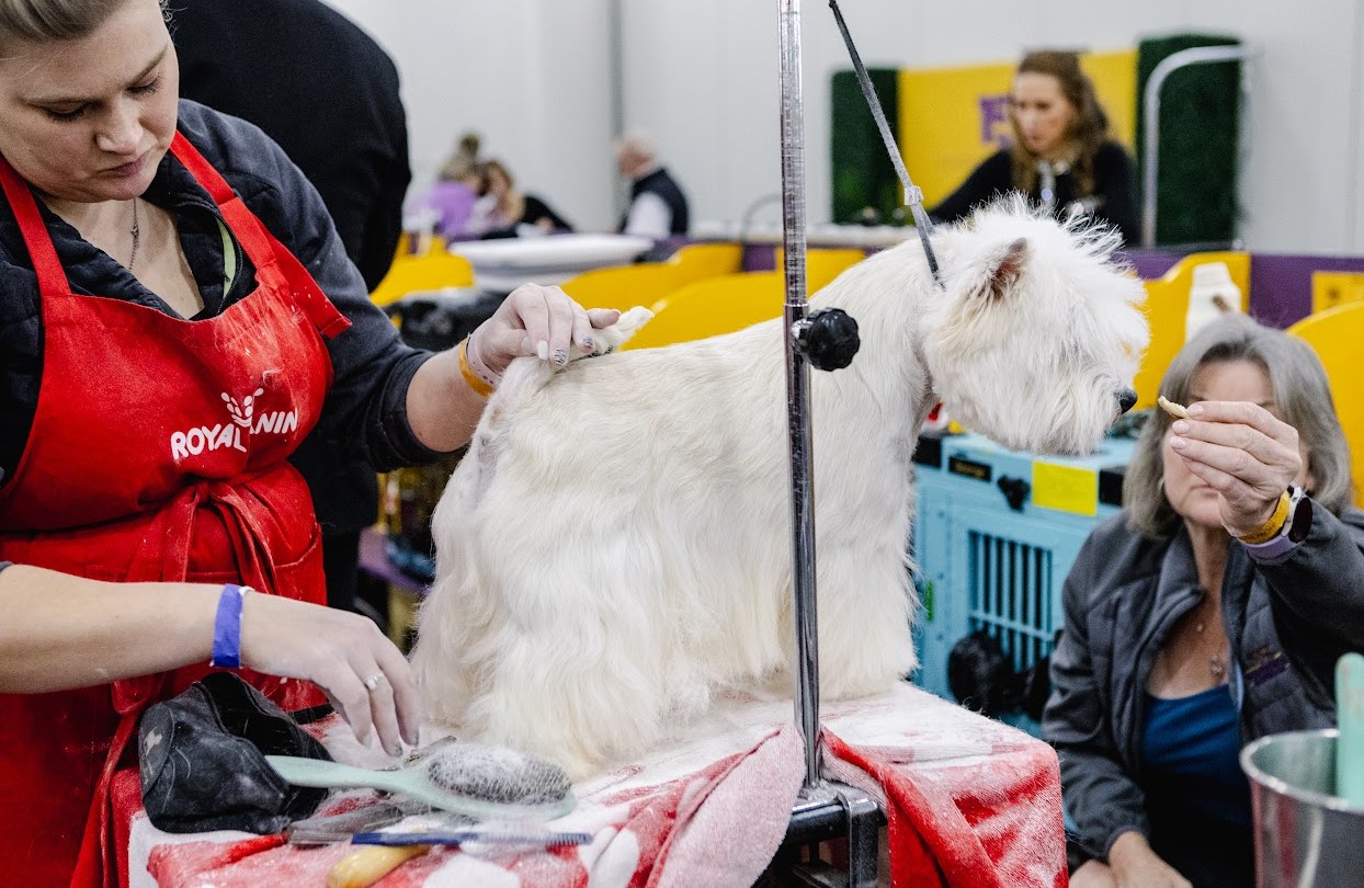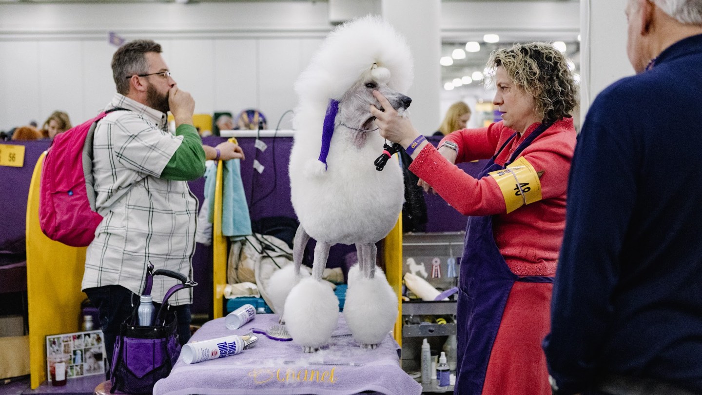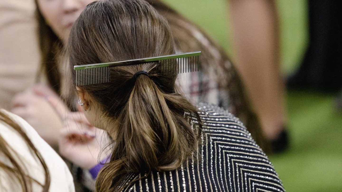 There are steel dog combs everywhere, occasionally tucked in the updos of handlers, other times held between human teeth when hands are occupied with leashes. Every few seconds, someone is stopping to brush out their dog again. Sometimes, they’ll mist them with antistatic spray.