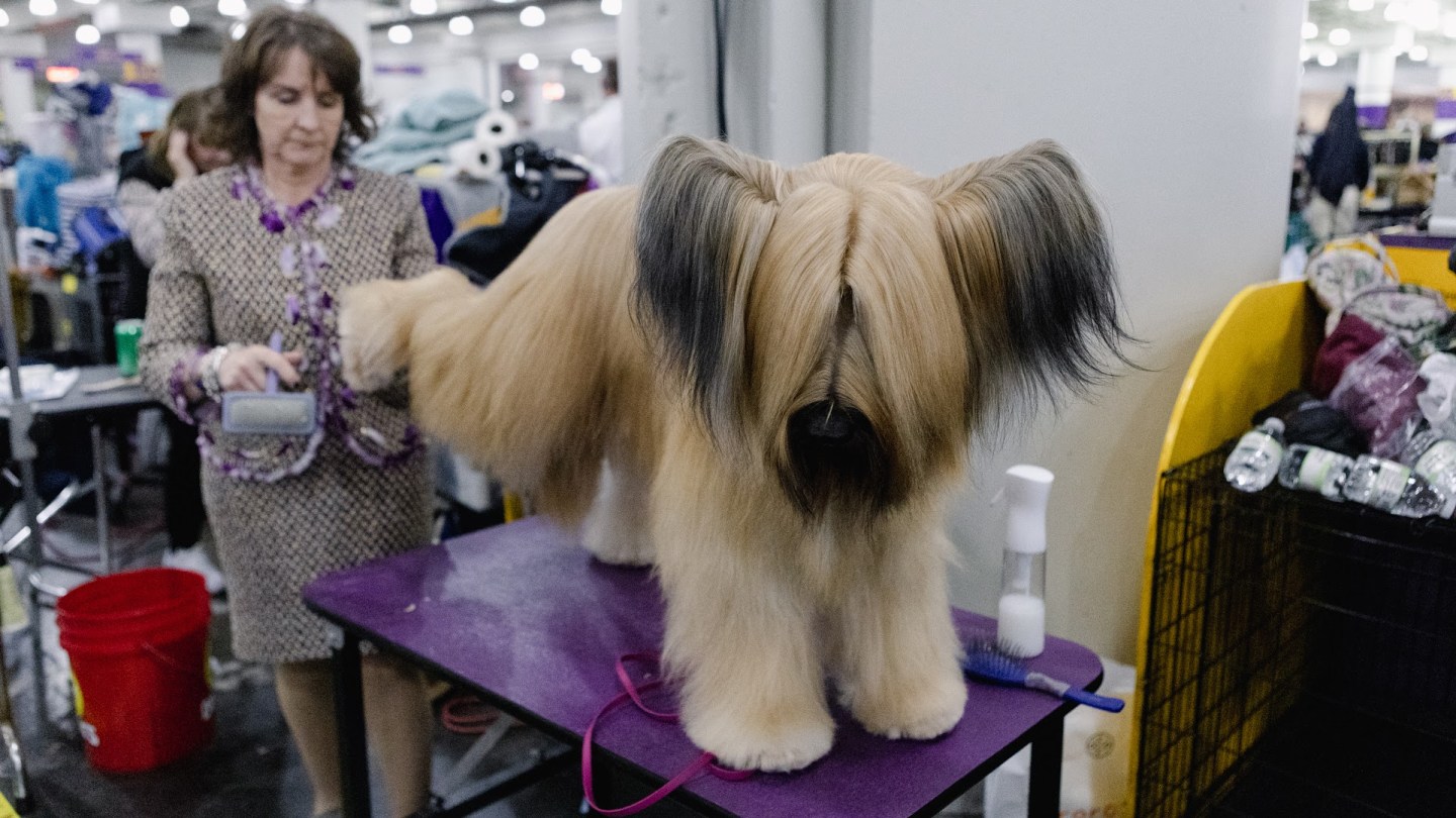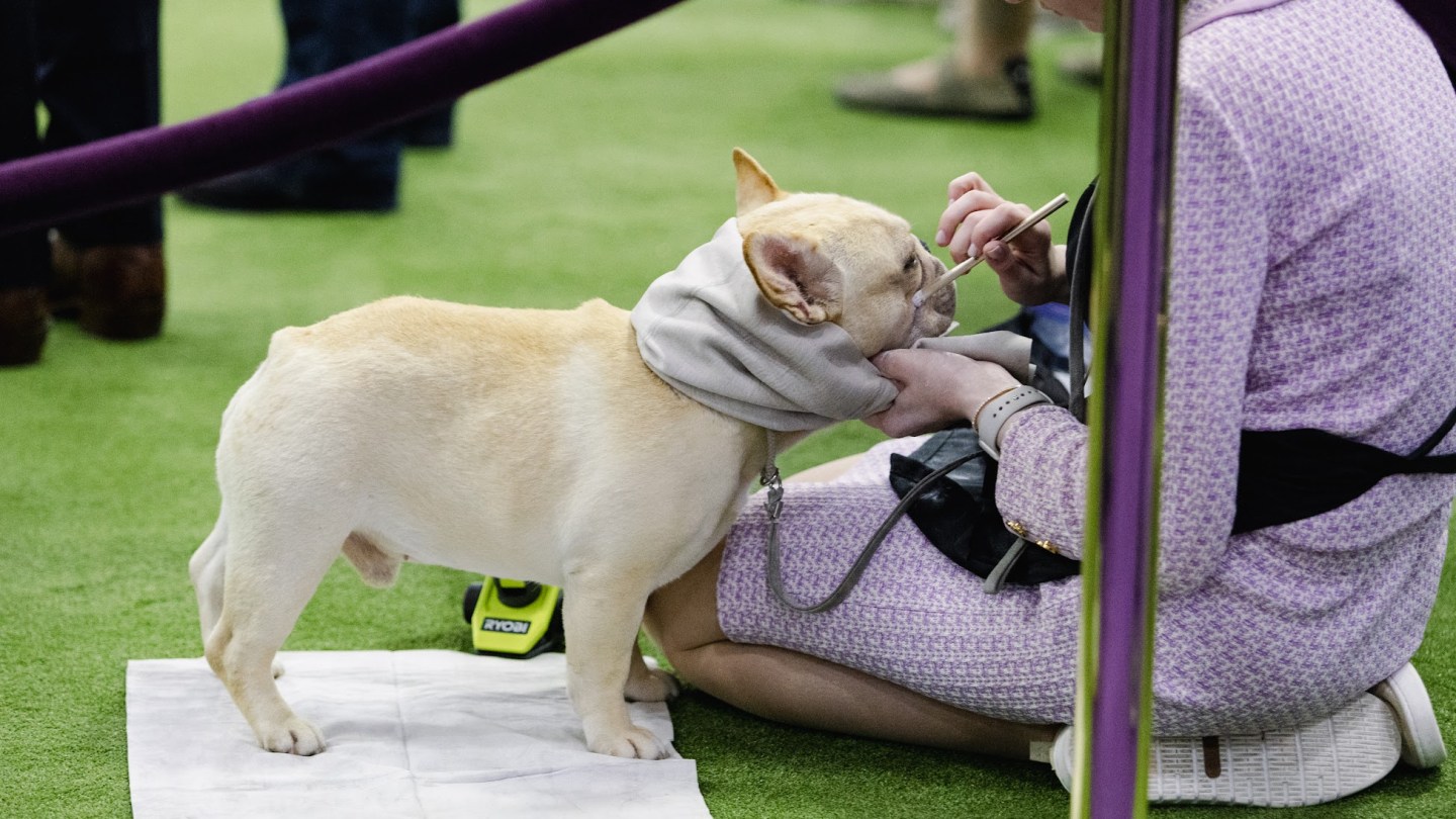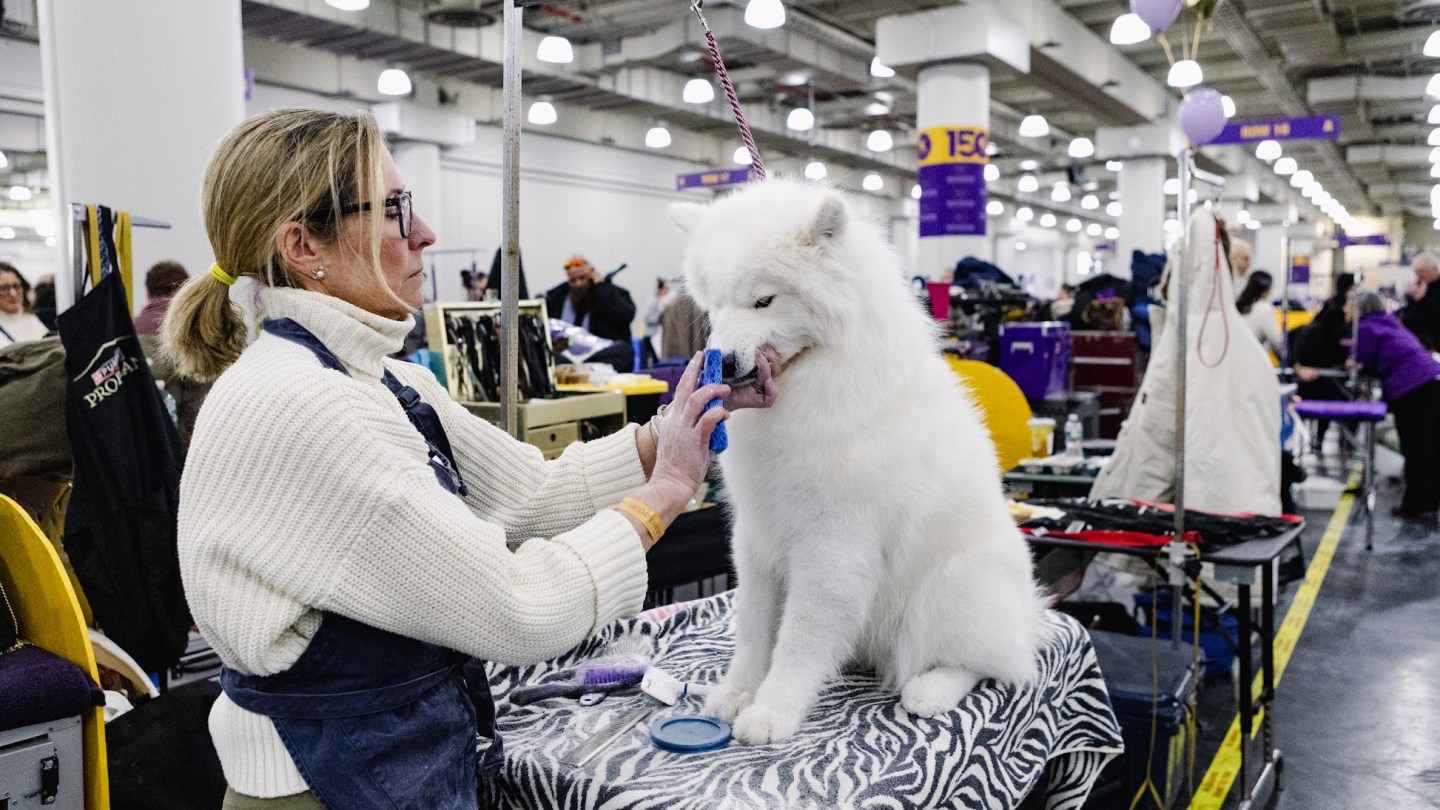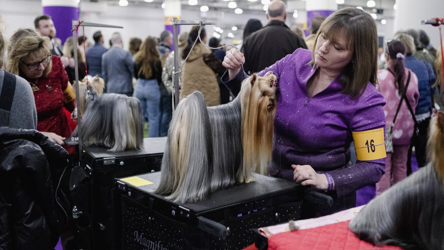 There are steel dog combs everywhere, occasionally tucked in the updos of handlers, other times held between human teeth when hands are occupied with leashes. Every few seconds, someone is stopping to brush out their dog again. Sometimes, they’ll mist them with antistatic spray.