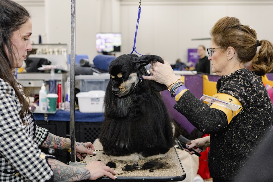 At any given moment hundreds of dogs are being prepped in the backstage benching area. The grooming never stops. Between barks and the occasional howl, there are suits being steamed, fur being straightened, black noses being buffed. This is the pinnacle of human obsession with the pursuit of aesthetics, channeled through man’s best friend. Dog shows are simultaneously about individuality and conformity. Breeds are trying to meet written aesthetic standards, but they are also trying to be singular. In many ways, the humans are no different. As one exhibitor tells me, “It’s the Dance Moms of dog shows.”