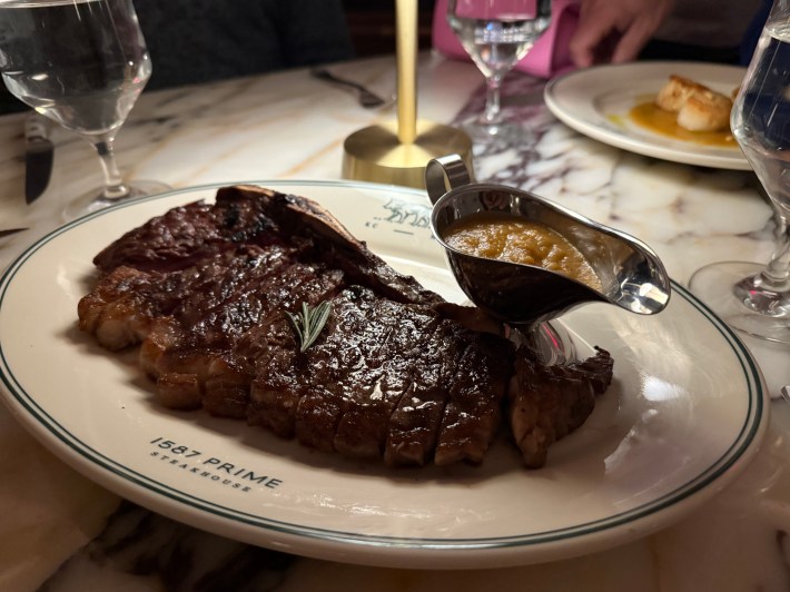 On my first visit, I ordered the six-ounce petite filet ($59), one of only three locally sourced steaks on the menu (the others are from Idaho, Australia, and Japan). Although I ordered it medium-rare, the steak arrived a generous medium, with a nice crust but an unpleasantly mealy interior. (Before someone vaults over a banister to tell me my mistake was ordering the filet, I should say: I like a filet, and it is not impossible to cook one well. But I have eaten a better version at a monk-themed novelty steakhouse than at 1587 Prime).