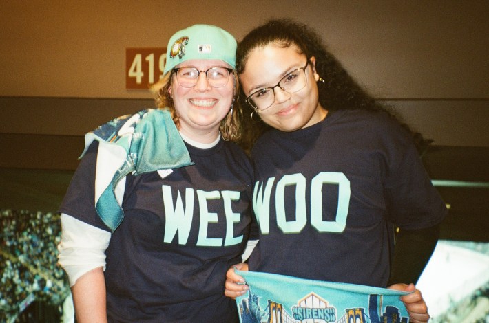 Some of this is likely an effect of so many people in the crowd attending or watching their first hockey game ever, learning audience etiquette in real time. The newcomers quickly picked up the Sirens’ unique “wee woo” chant. Trish M., who has the loudest voice I have ever heard, led a call-and-response two sections away from me. I felt so rallied by her shouts that I wee-wooed too. Trish told me that she only started attending Siren games earlier this season, but she and her friend had matching “WEE” and “WOO” shirts.