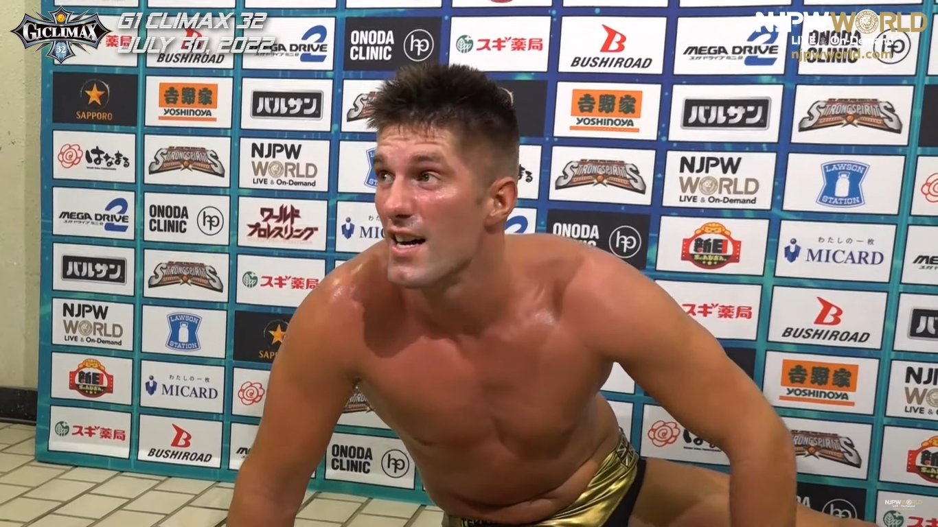 In keeping with New Japan's attempts to present its events as much like "real sports" as possible, every show of theirs also comes with each wrestler giving post-match promos in the back that mimic the aesthetics of boxing and MMA press conferences. With 20 G1 shows in a one-month span this year, this could very easily get monotonous. But Sabre couldn't be boring if he tried. Night after night, seemingly trying to entertain himself more than anything else, Sabre goes on wild, profane stream-of-consciousness sprees of cheeky insults and ambitious delusions. Here are some highlights: calling his British rival Will Ospreay a bunch of names; painting a hilariously graphic picture of NJPW cornerstone Hiroshi Tanahashi continuing to wrestle into his 70s; noting how he prefers the avant-garde composer John Cage to Tana's air guitar antics; best of all, speaking about a George Michael hallucination he had before making a comeback—a delightful recurring motif in Sabre promos.